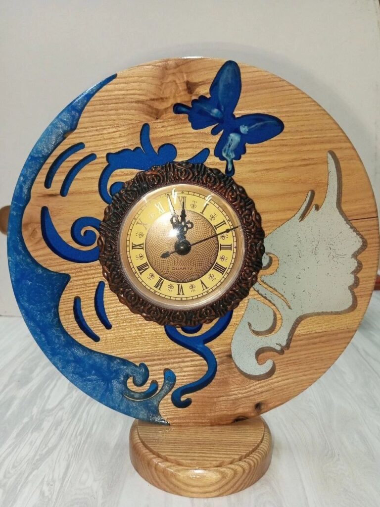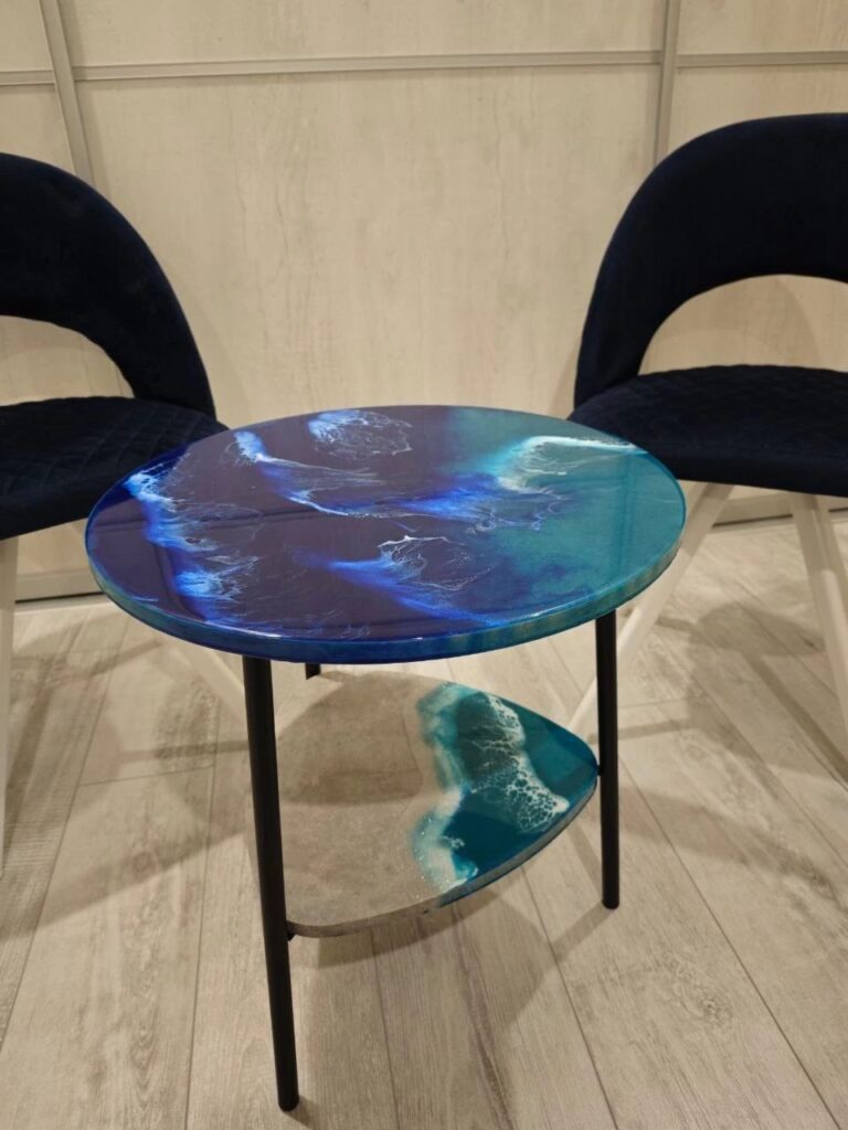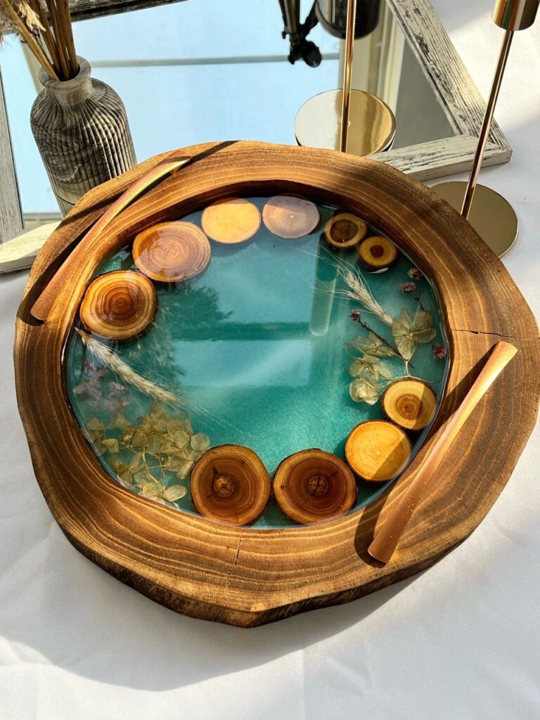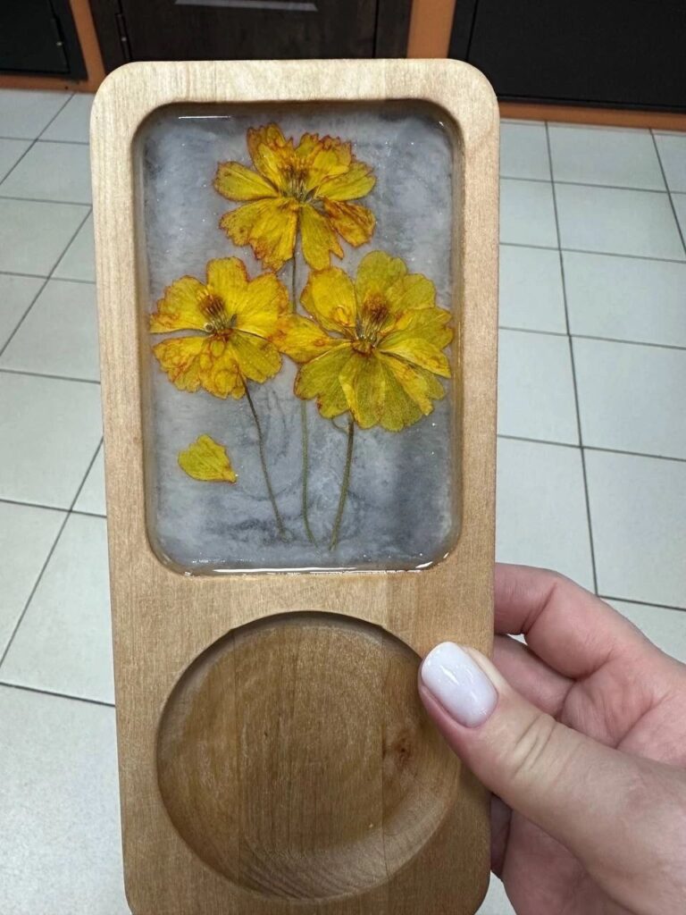 «Найбільше у мене сувенірів, предметів побуту. Роблю навіть посуд. Він напівпрозорий і дуже цікавий. Крім того, маю в доробку і прикраси. Пробувала створювати картини, годинники. Але особливо мене тішать меблі. Передусім – столи. В нашому будинку вже 4 столи мають епоксидну поверхню і авторську оздобу. Також покриваю смолою полиці, стільці, лавки, тумби. Роблю усілякі підноси, підставки для телефонів, органайзери. Влітку багато квітів, рослинності. Якщо їх «обгорнути» у оболонку зі смоли, вони можуть стати унікальним доповненням для будь-якої деталі інтер’єру. Також люблю створювати підсвічники, рамки для фото, вази, підставки під чашки. До смоли, між іншим, можна додавати не тільки фарби та рослини, але й мушлі, камінці, блискітки, будь-що. Головне, аби це мало гарний гармонійний вигляд, аби деталі поєднувалися між собою», – зізнається вона.