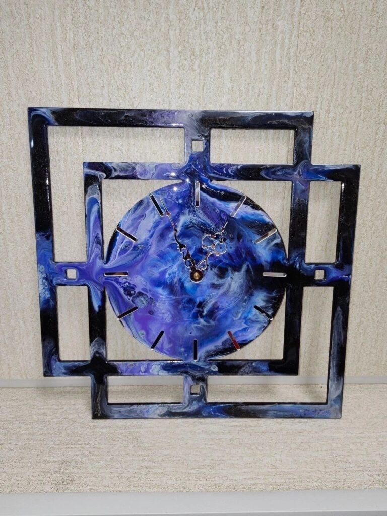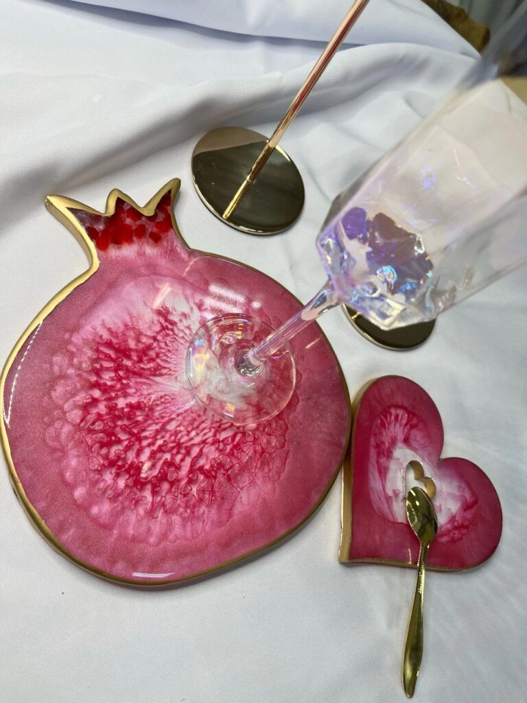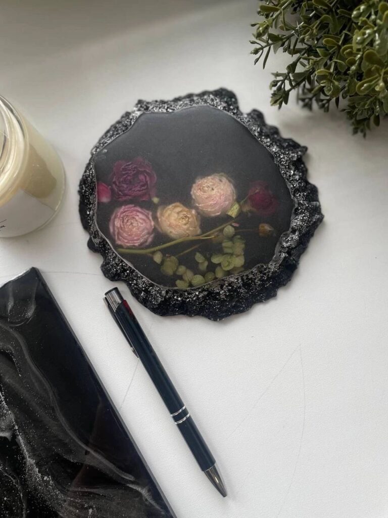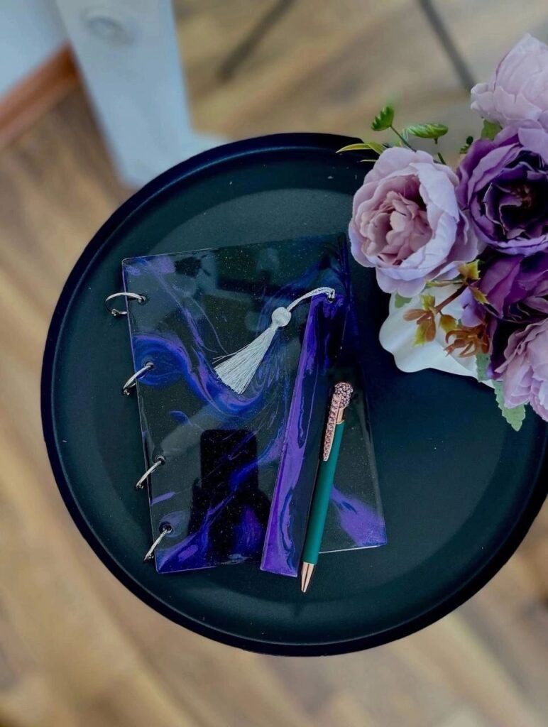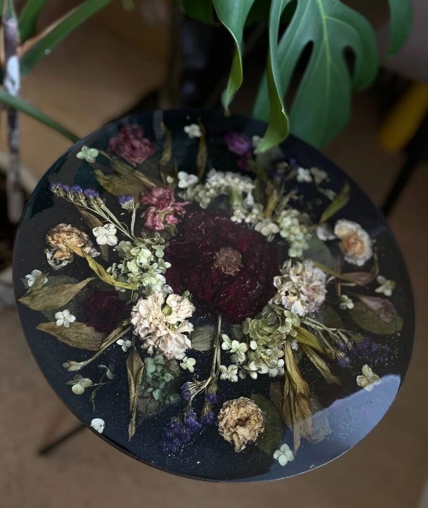 «Найбільше у мене сувенірів, предметів побуту. Роблю навіть посуд. Він напівпрозорий і дуже цікавий. Крім того, маю в доробку і прикраси. Пробувала створювати картини, годинники. Але особливо мене тішать меблі. Передусім – столи. В нашому будинку вже 4 столи мають епоксидну поверхню і авторську оздобу. Також покриваю смолою полиці, стільці, лавки, тумби. Роблю усілякі підноси, підставки для телефонів, органайзери. Влітку багато квітів, рослинності. Якщо їх «обгорнути» у оболонку зі смоли, вони можуть стати унікальним доповненням для будь-якої деталі інтер’єру. Також люблю створювати підсвічники, рамки для фото, вази, підставки під чашки. До смоли, між іншим, можна додавати не тільки фарби та рослини, але й мушлі, камінці, блискітки, будь-що. Головне, аби це мало гарний гармонійний вигляд, аби деталі поєднувалися між собою», – зізнається вона.