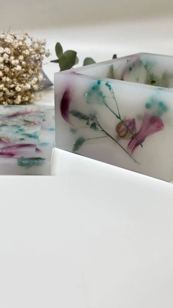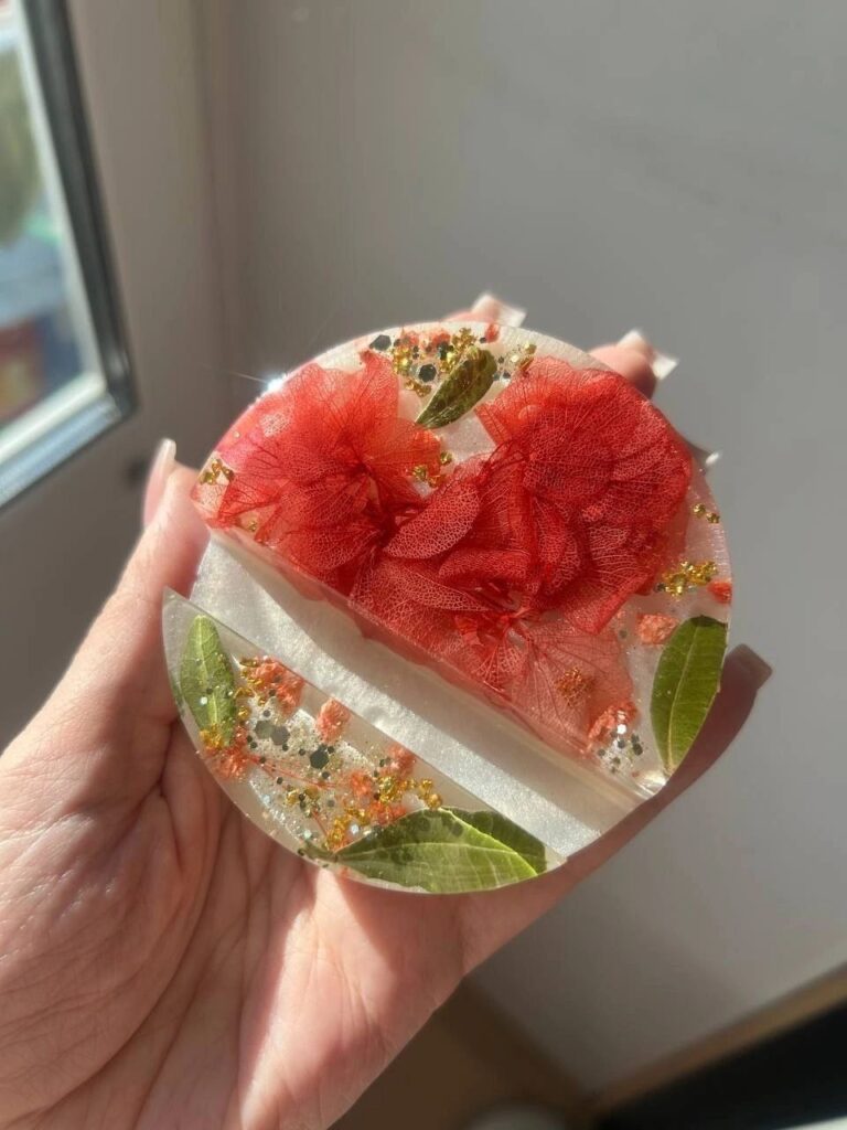 Смолу, як ділиться досвідом майстриня, можна заливати у різні форми, додавати у неї барвники, заливати нею рослини та різні поверхні.