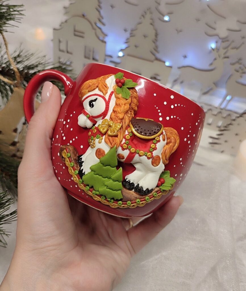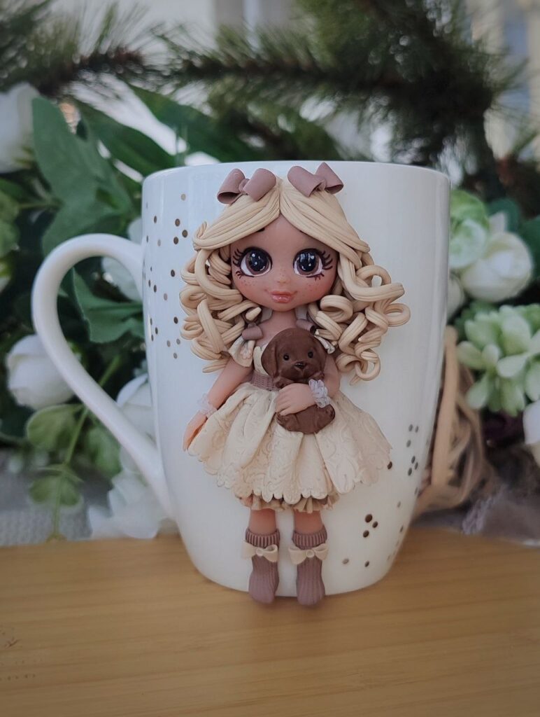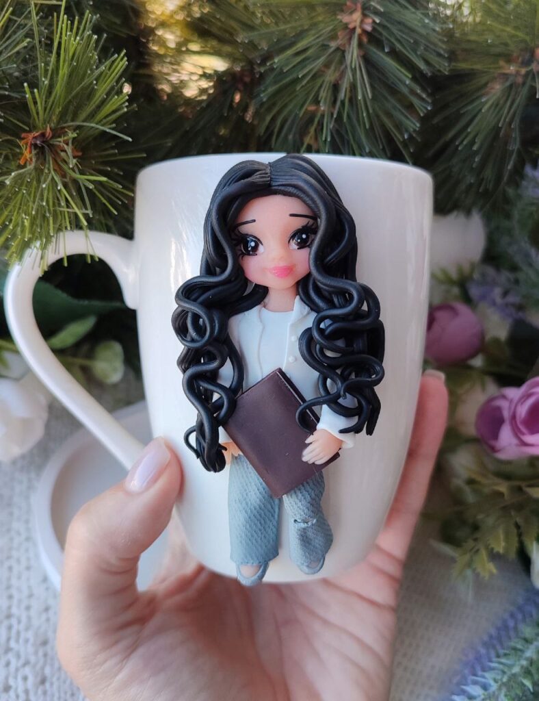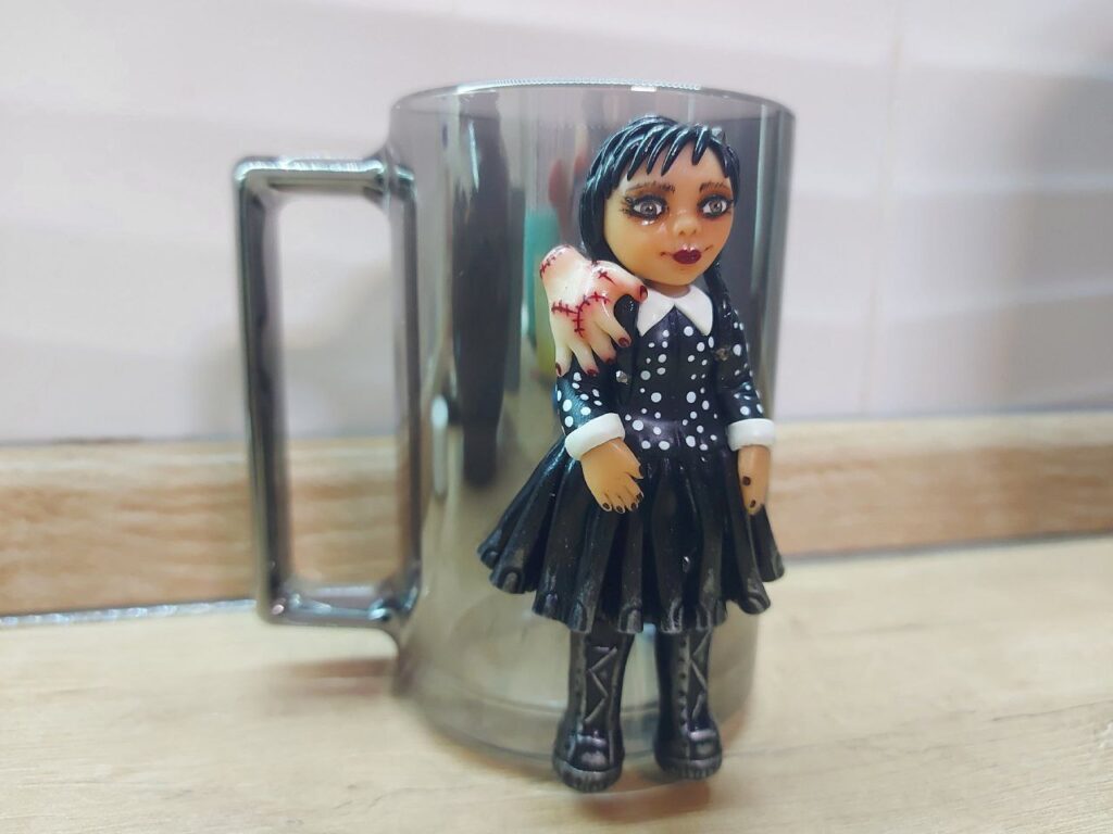 «Найбільше люблю працювати над образами ляльок-дівчаток. Напевно ще сама з дитинства не виросла. Але не цураюся практично нічого. Якось оздоблювала чашку для дівчини-підлітка фігуркою у вигляді персонажа Венздей Аддамс та її супутника, Руки, з серіалу «Венздей». Для хлопчика ліпила Пеннівайза з фільму «Воно». Маю в колекції і модні нині Лабубу, і багато іншого», – зазначає вона.