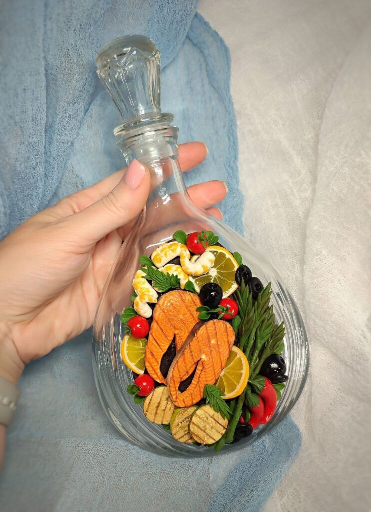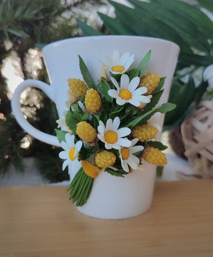 «Я оздоблюю не тільки чашки, але й декоративні тарілки, підноси, цукрянички, ємності для спецій, пляшки, контейнери для круп та багато іншого. Купую готовий посуд, або мені його приносять… і декорую. Надаю перевагу кераміці, але причепурити фігурками з полімерної глини можна навіть скло, – стверджує умілиця. – Найбільше у моєму доробку саме чашок. Їх – більше сотні. З прикрасами зараз не працюю взагалі, а от статуетки деколи створюю – для власного задоволення. Люблю розставляти їх на поличках поміж книгами. Люблю ліпити різні сердечка з тваринками, органайзери для доньки, усілякі дрібнички для сина, чоловіка та для себе».