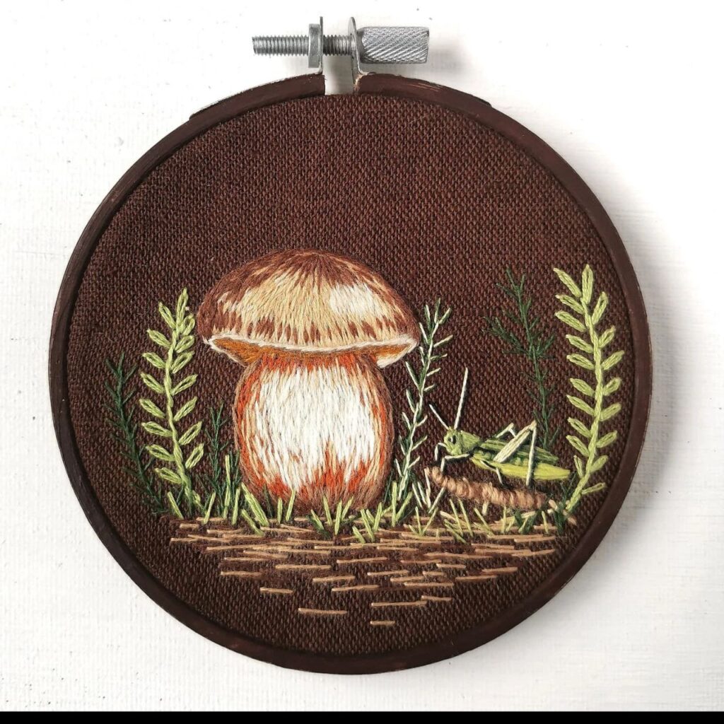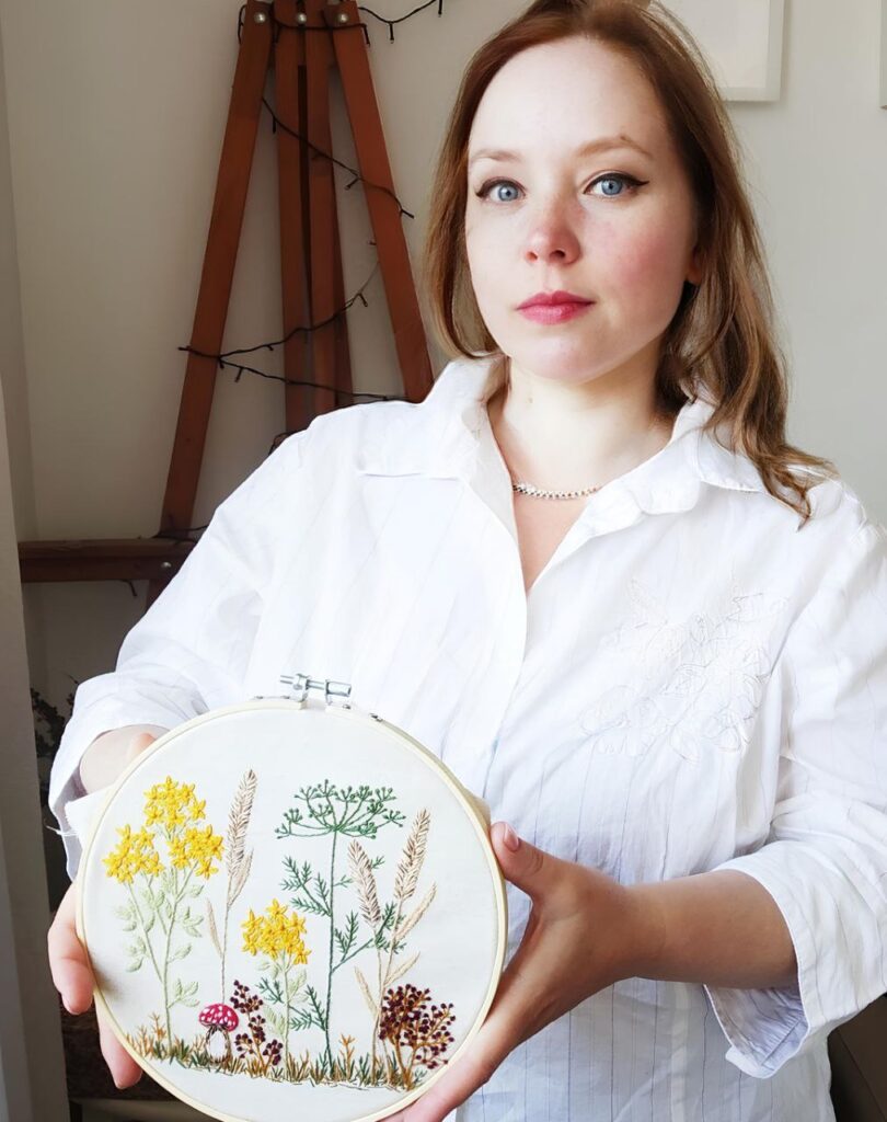 «Я дуже люблю природу. Саме серед гір, дерев, струмків завжди відпочиваю душею. Оточення людей втомлює і виснажує. Природа ж відновлює сили та внутрішню рівновагу. Тому вишивати так само люблю наодинці. Компанія мені не потрібна. Зі мною поруч котик Моріс і його мені достатньо. Я працюю, він муркоче. І це заспокоює нерви, допомагає розслабитись. Також мене завжди радують квіти. Тому вирішила, що переноситиму на тканину те, що дарує мені найбільшу втіху. Рослини – це завжди позитив, візуальна насолода та приємні емоції. Можна, звичайно, і портрети вишивати, та мені більше імпонують квіти і трави», – зізналася вона.