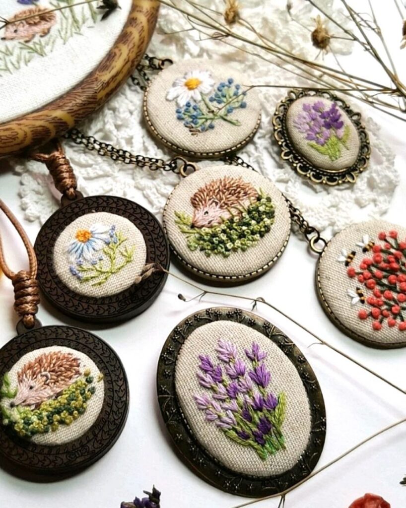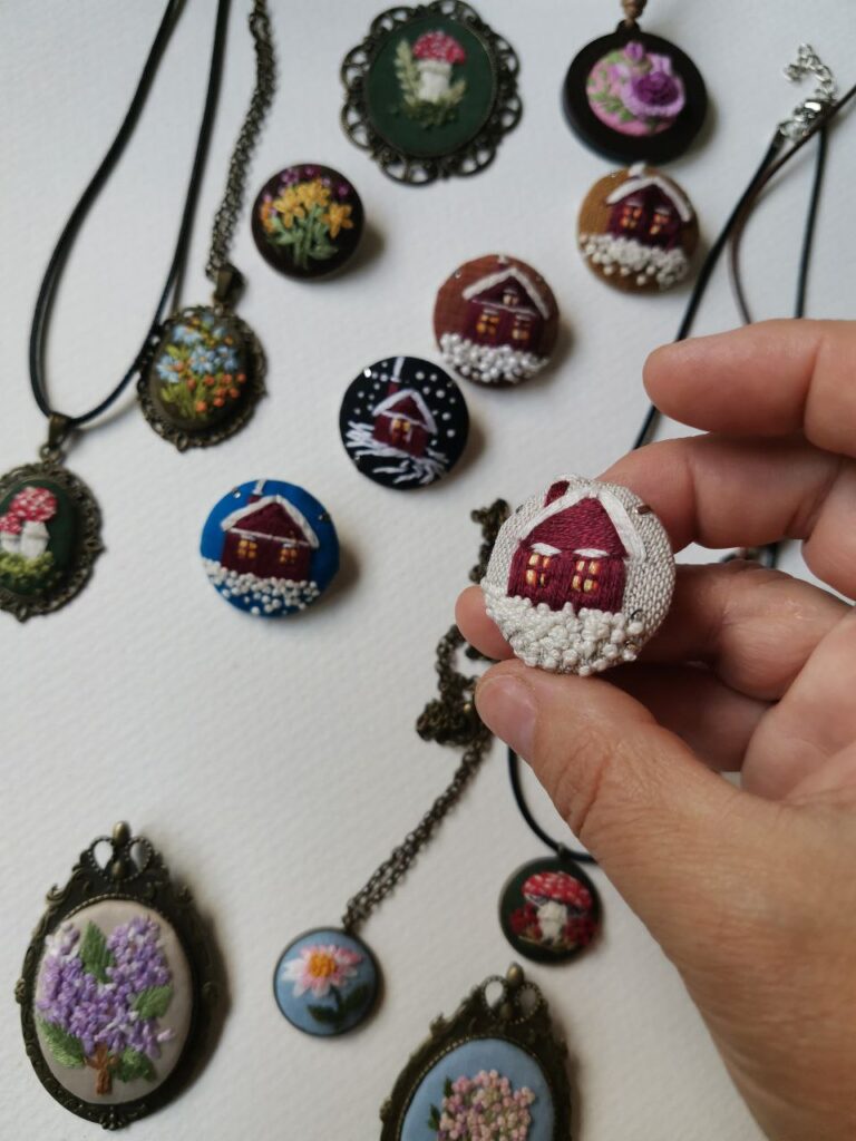 «Мініатюрні деталі вимагають хорошого зору. Я вишиваю в окулярах, бо короткозора з років 13. Робота ж клопітка, усе має бути акуратно. Комусь здається, що з кулоном, наприклад, можна впоратися за кілька хвилин. Та це не так. Як мінімум, потрібно годин 2-3. Крім того, усе починається з пошуку ідеї, з підбору форнітури. А для цього теж потрібен час. Та й вишивання для мене – тільки хобі. Із нього не прожити. Тому цілий день займаюся іншим, працюю у сфері краси», – стверджує Валентина.
